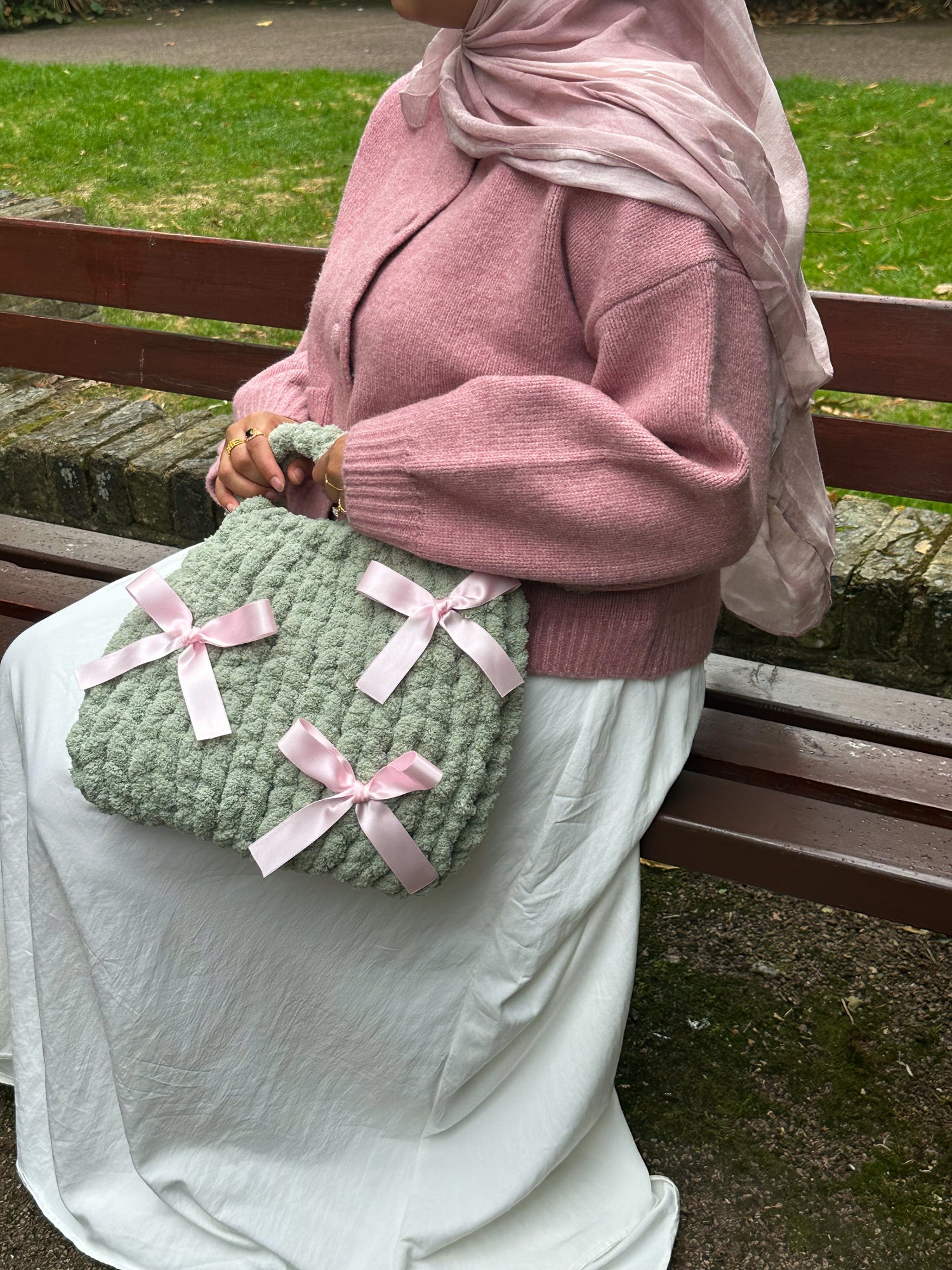 The dreamiest sage green teddy bag complete with pretty pink satin bows 🎀 fully lined with our 100% cotton fabric!